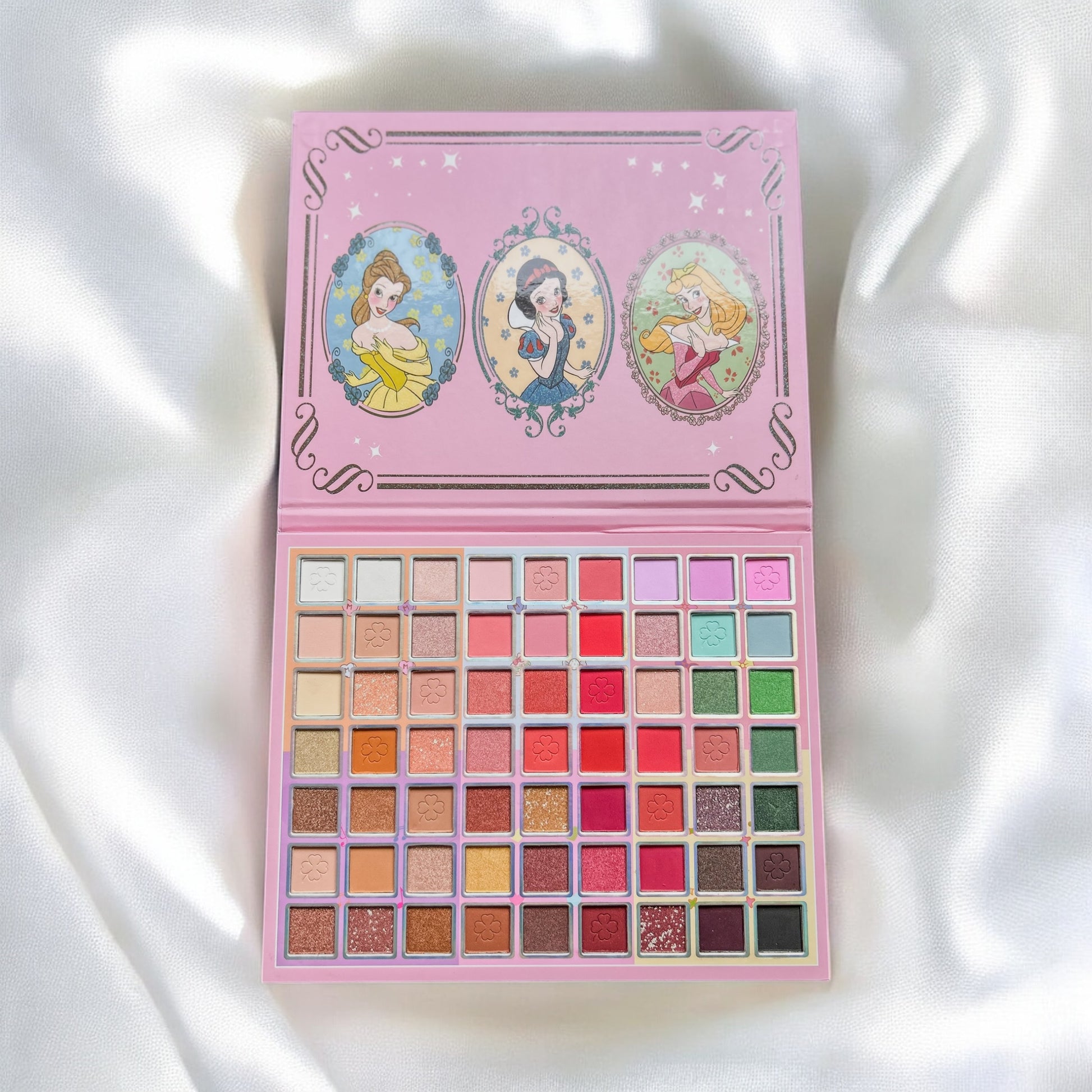 Paleta de sombras con 63 tonos entre mates y satinados. Una paleta super girly inspirada en las Princesas de Disney.